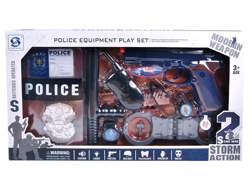 Súprava pre mladého policajta sa skladá z mnohých prvkov. Všetky sú vyrobené z kvalitného plastu, čo je zárukou, že budú vášmu dieťaťu dlho slúžiť. Pištoľ v čierno-hnedej farbe má zvukovú a svetelnú funkciu . Po stlačení spúšte vydáva zvuk streľby a rozsvieti sa červeným svetlom.