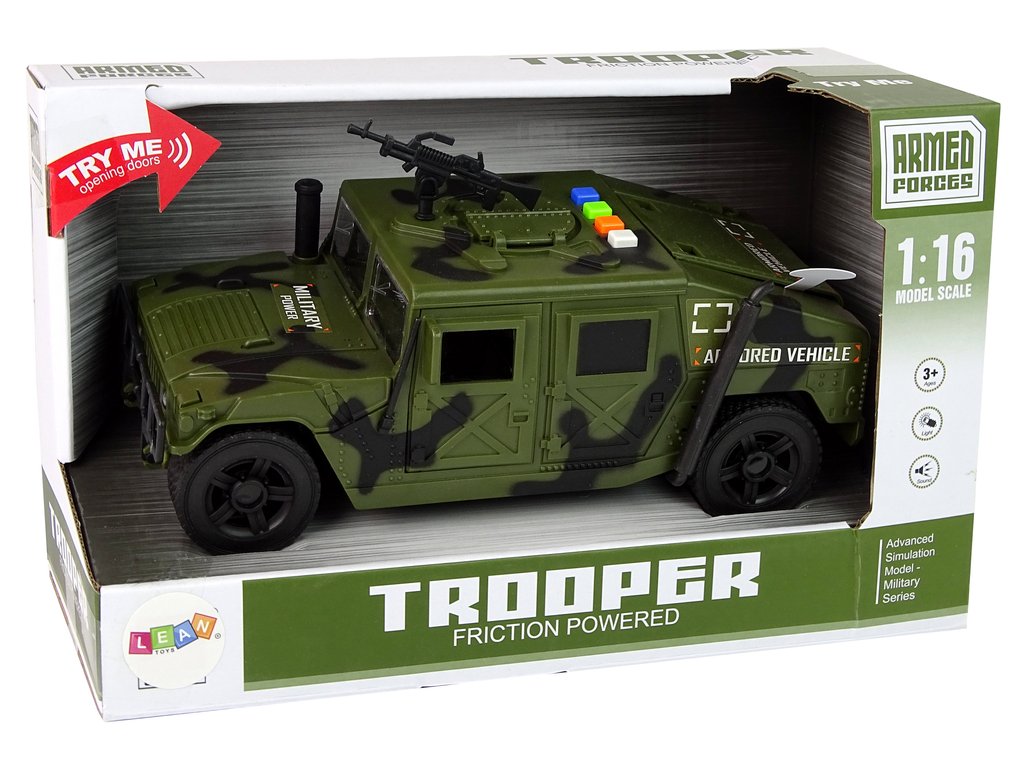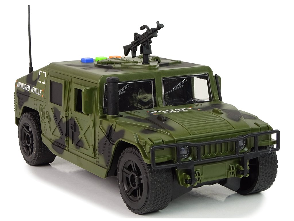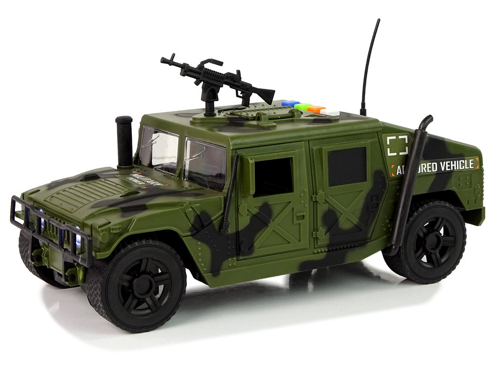 Toto vojenské vozidlo je ideálne pre malých nadšencov armády, ktorí sa chcú zoznámiť s vojenskou technikou. Má autentický vzhľad a detaily, ako je pištoľ na streche, ktoré pripomínajú skutočné armádne vozidlo.