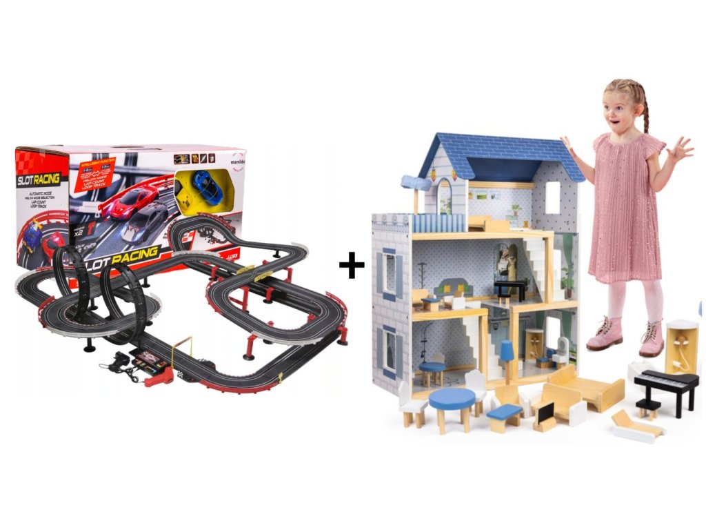 Výhodná sada Autodráha Gigant 1420cm + Domček pre bábiky Roxana s nábytkom a príslušenstvom XL 78cm 15ks + LED osvetlenie