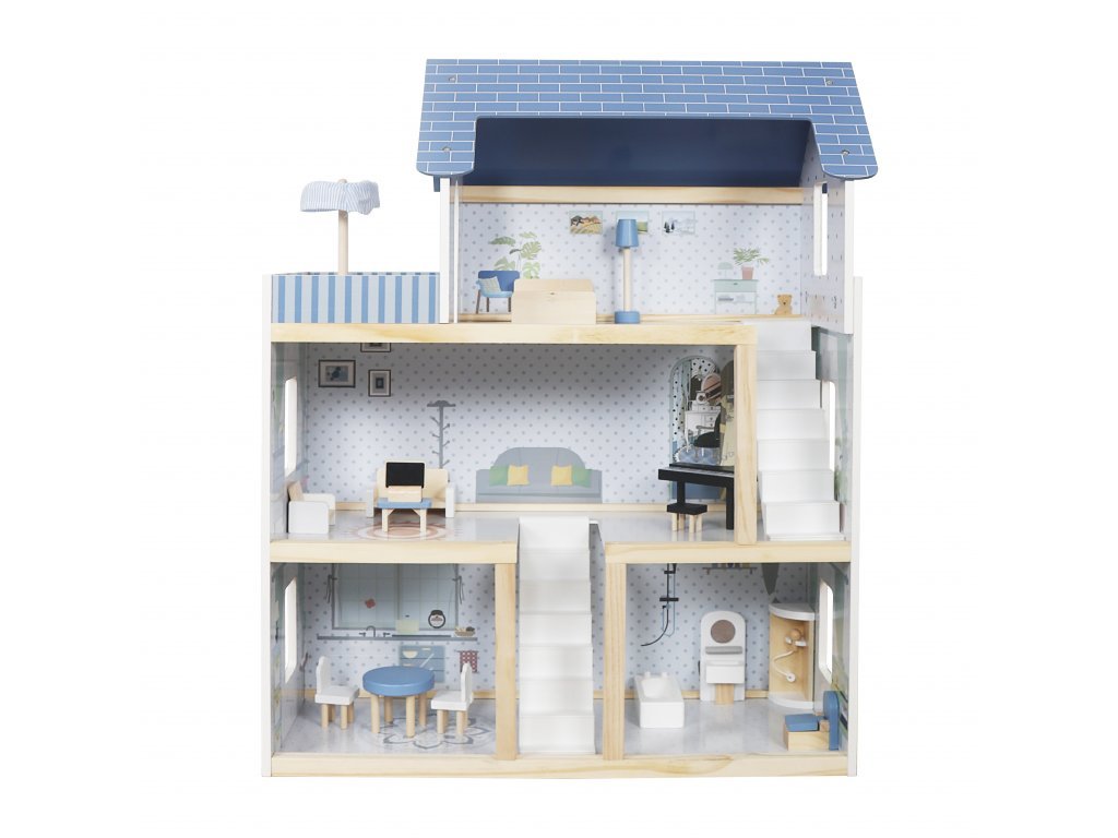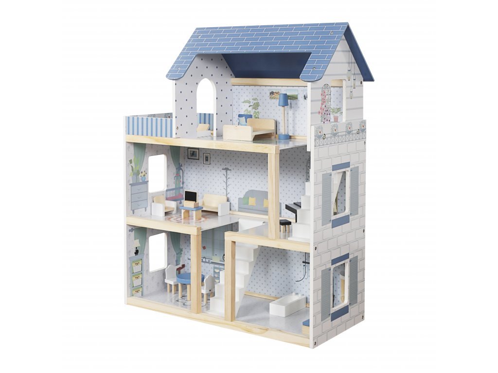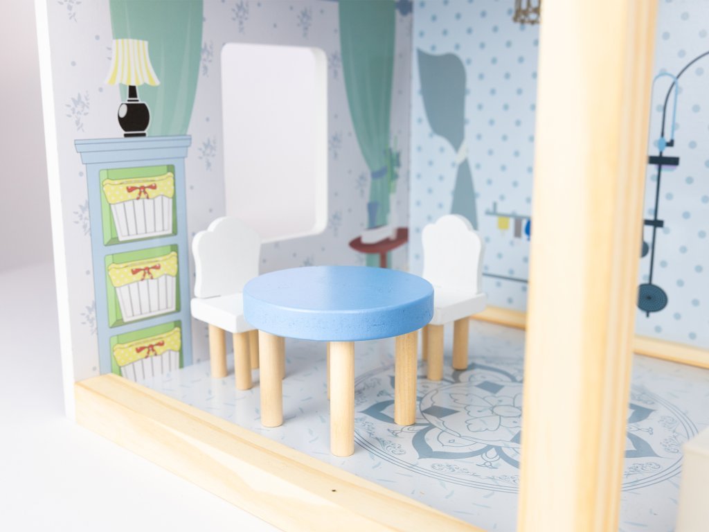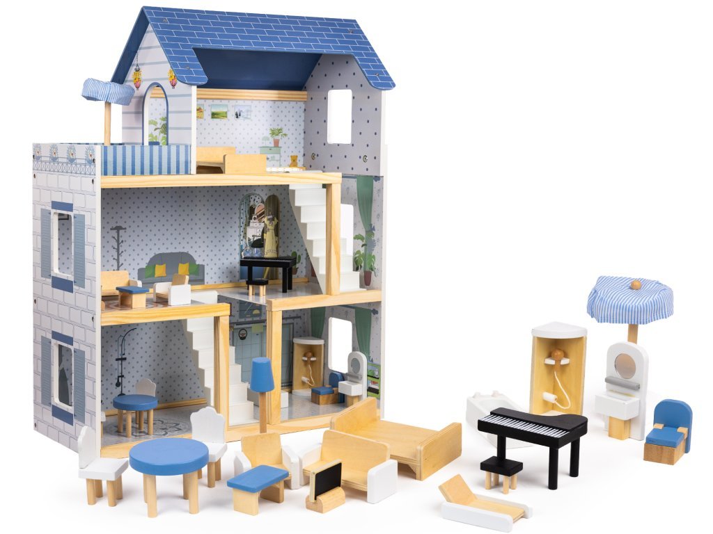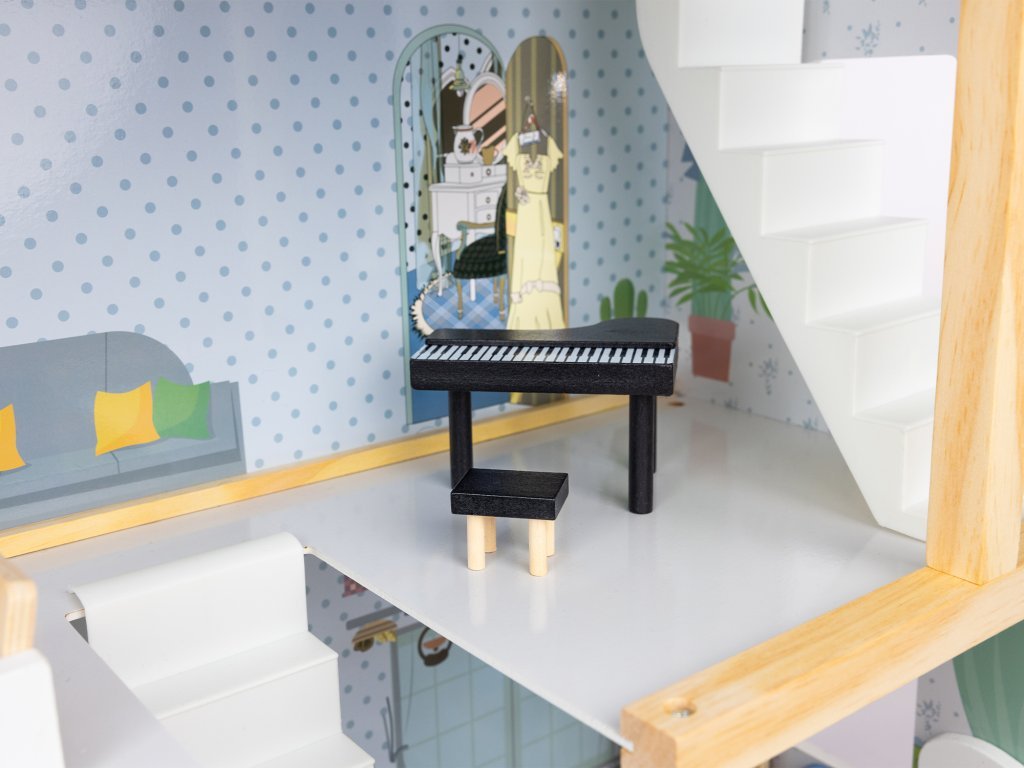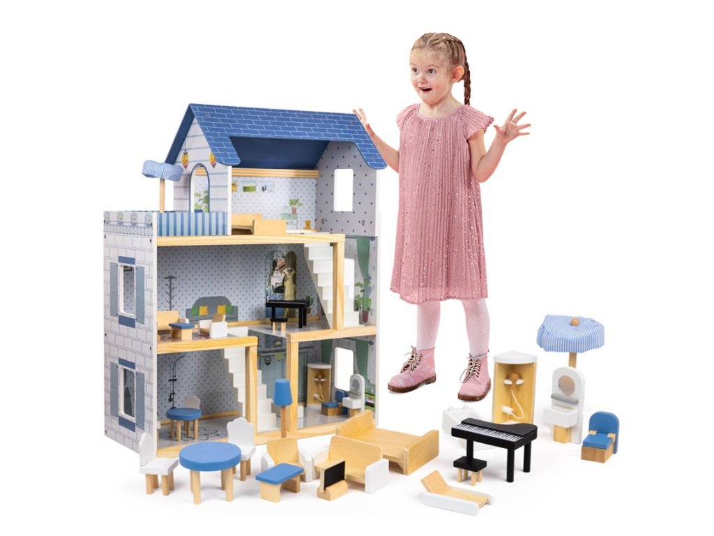 Tento nádherný trojposchodový domček pre bábiky, vyrobený z vysoko kvalitnej MDF dosky a masívneho dreva, ohromí svojim detailným dizajnom a živými farbami, ktoré rozžiaria každú detskú izbu.