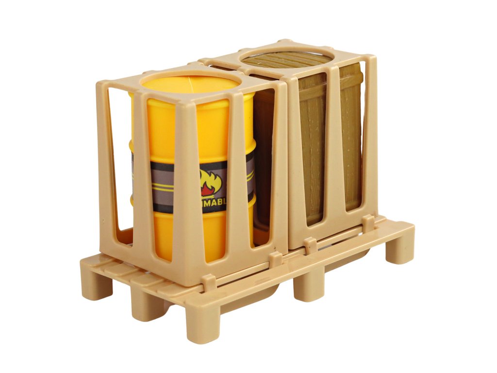 Ovládanie pohyblivých vidlíc pomocou precízneho gombíka pomáha dieťaťu rozvíjať jemnú motoriku a koordináciu ruky a oka. V balení nájdete aj paletu s barelom a debnou, ktoré pridávajú možnosti pre rôzne hry a scenáre.