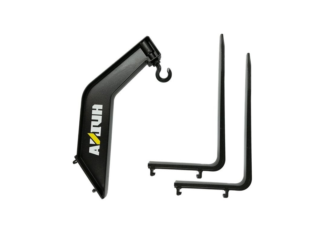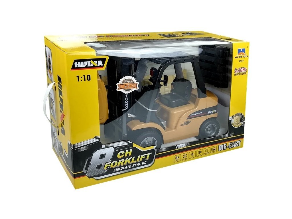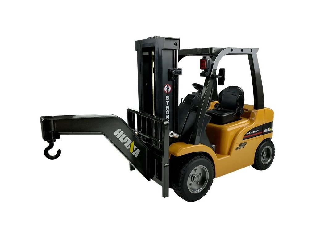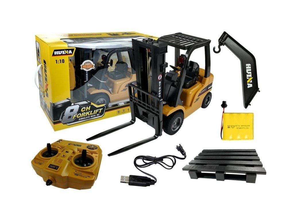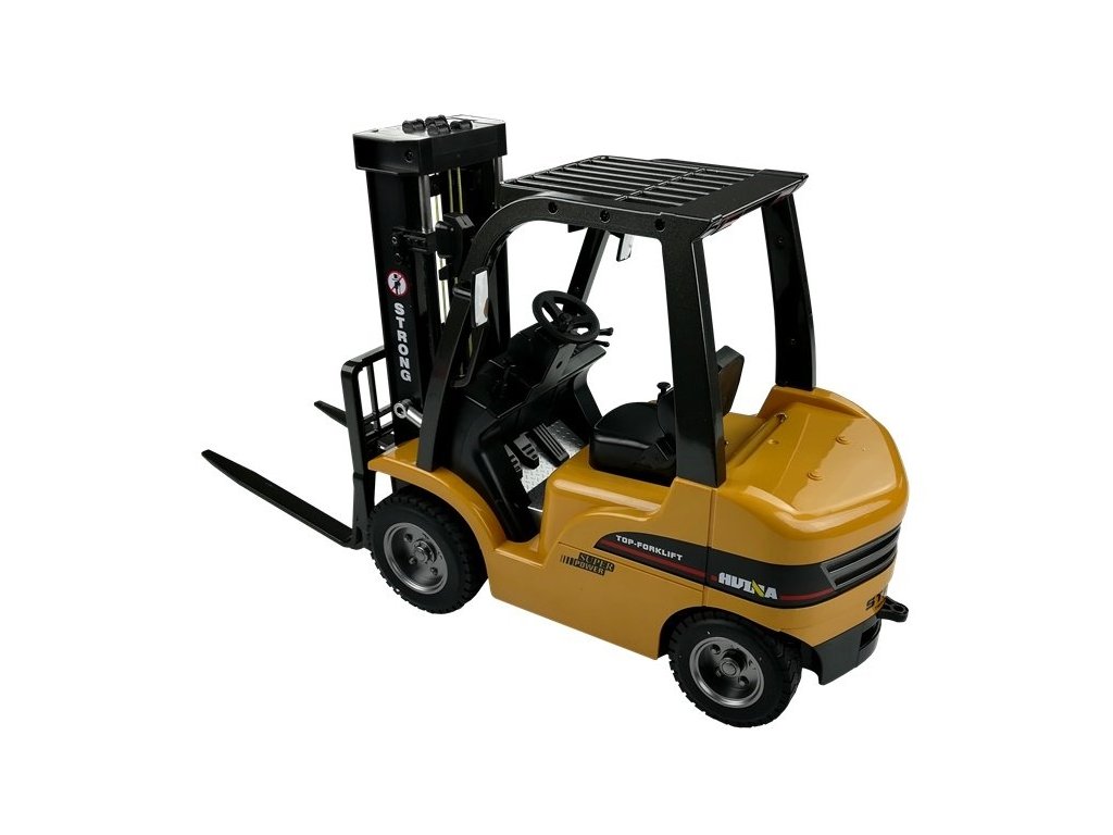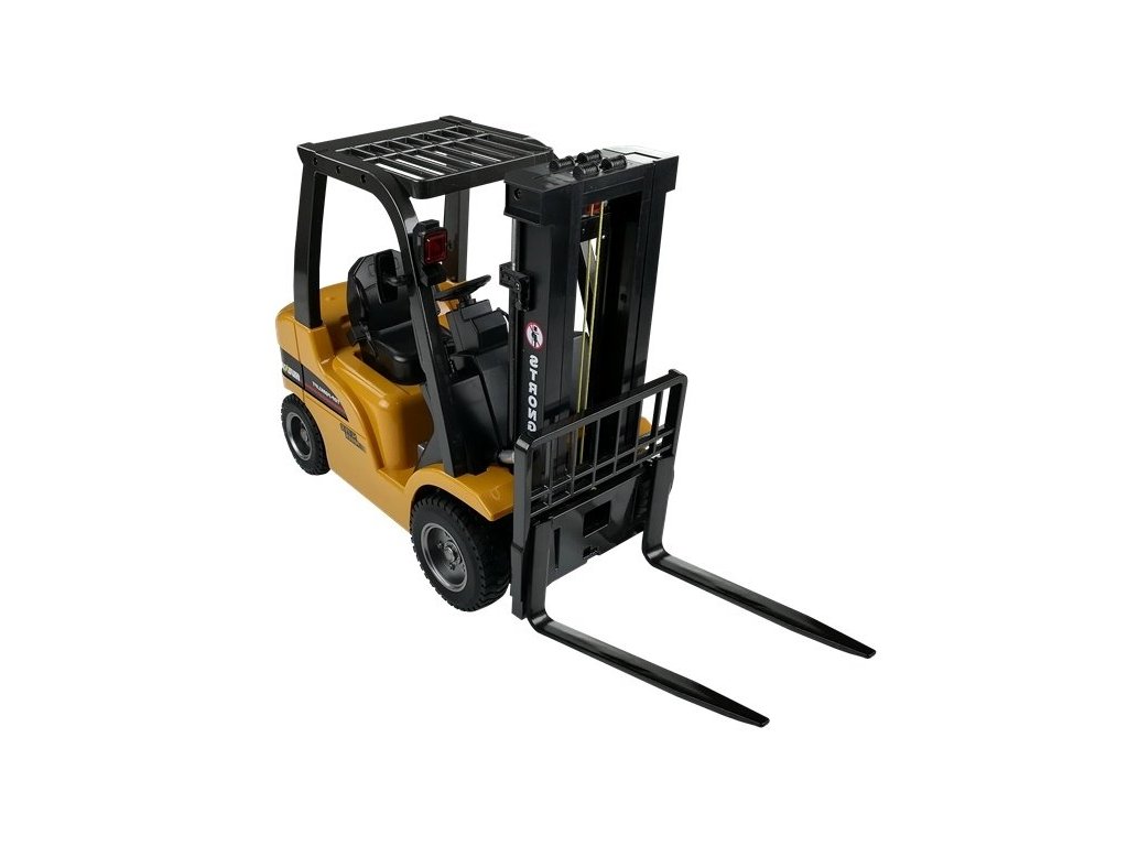 Vysokozdvižný vozík má dve palety na prepravu tovaru. Okrem funkcie "vysokozdvižného vozíka" má vozík odnímateľný prvok s hákom, vďaka ktorému môže fungovať ako výťah. Diaľkový ovládač používaný na ovládanie vozidla je vybavený veľkými ovládacími gombíkmi, vďaka ktorým ho môžu pohodlne používať ľudia s rôznymi veľkosťami rukou. Vysokozdvižný vozík je poháňaný veľkou batériou 7,2 V, čo zaručuje dlhú a bezproblémovú zábavu. Diaľkový ovládač je napájaný štyrmi batériami AA - nie sú súčasťou sady.