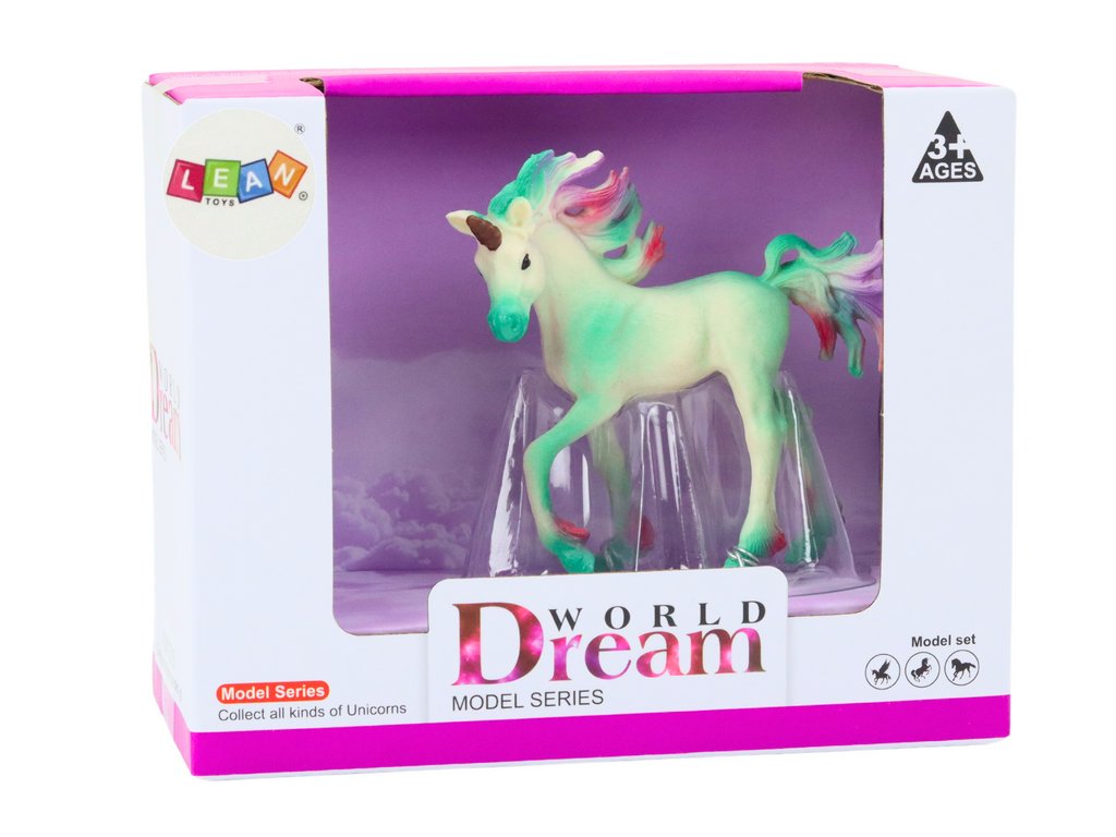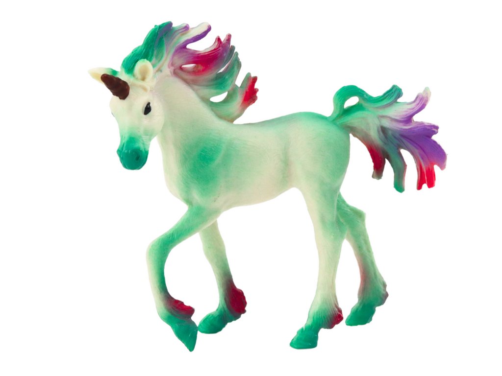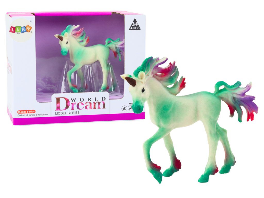 Hriva a chvost jednorožca sú farebné, čo mu dodáva rozprávkový pôvab a figúrka tak priťahuje pozornosť svojimi živými farbami. Farebné prvky skvele kontrastujú so zeleným telom, tvoriacim harmonický a estetický celok.