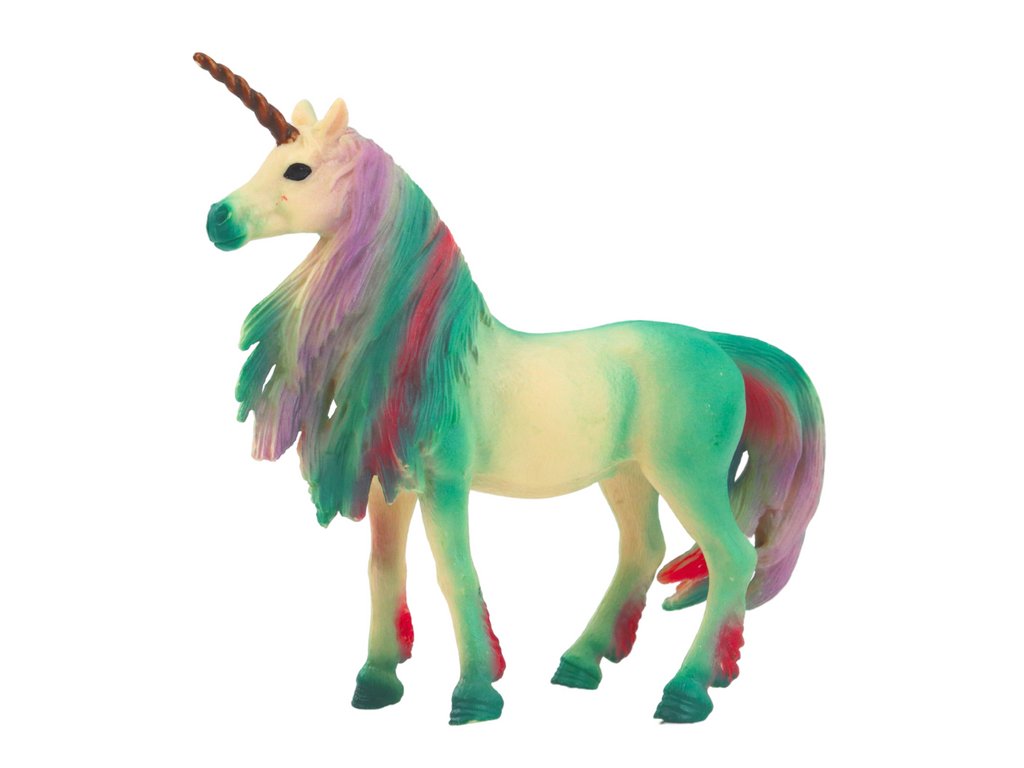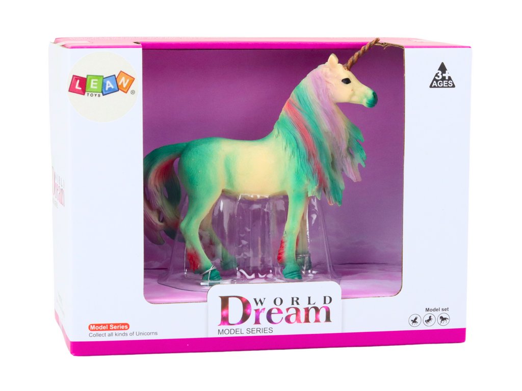 Hriva a chvost jednorožca sú farebné, čo mu pridáva rozprávkový pôvab a figúrka priťahuje svojimi živými farbami. Farebné prvky skvele kontrastujú so zeleným telom, čím vytvárajú harmonický a estetický celok.